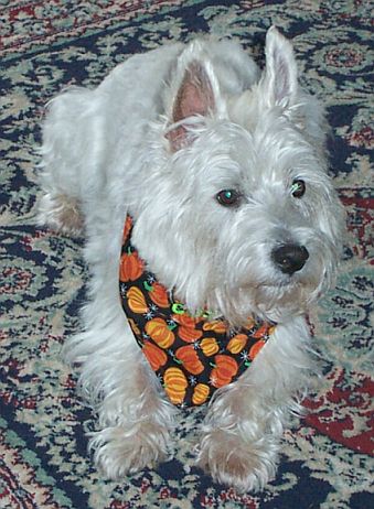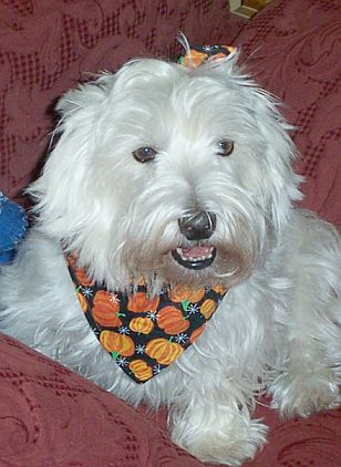 BOO BEAR Boo Bear found a new home in the fall of 2005 thanks to Westie Rescue. His new mom says, "He is a delight and has brightened up our home!" |