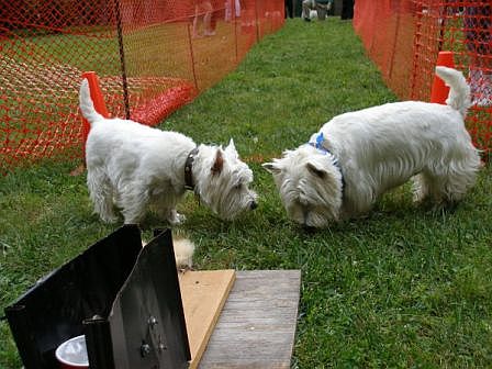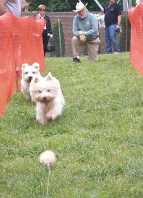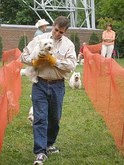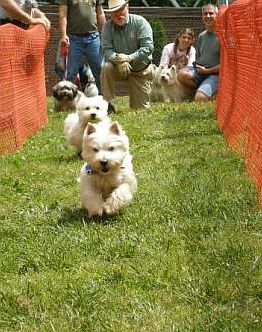 WR's devoted Chief, Stephen DiGiulian, takes a break from the terrier races, where a fur lure entices a pair of Westies to chase! Hundreds of westies each year find new homes with his and his volunteers' efforts! |